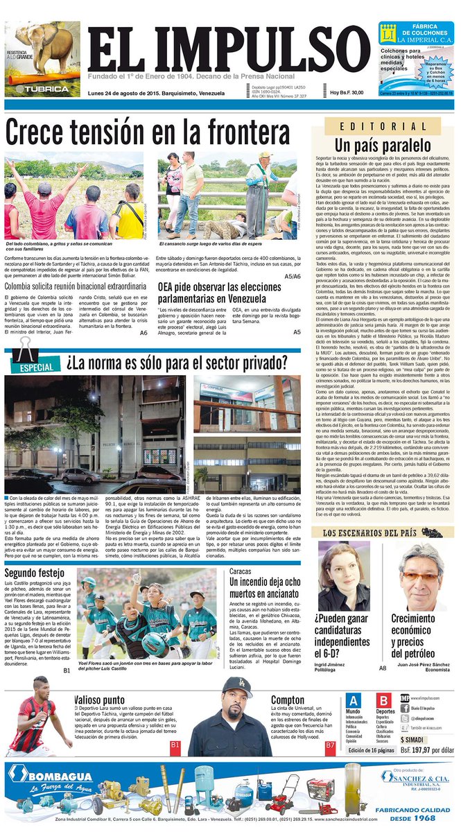 Buenos días, feliz inicio de semana, aquí la primera página del Diario EL IMPULSO este lunes 24/08/2015
