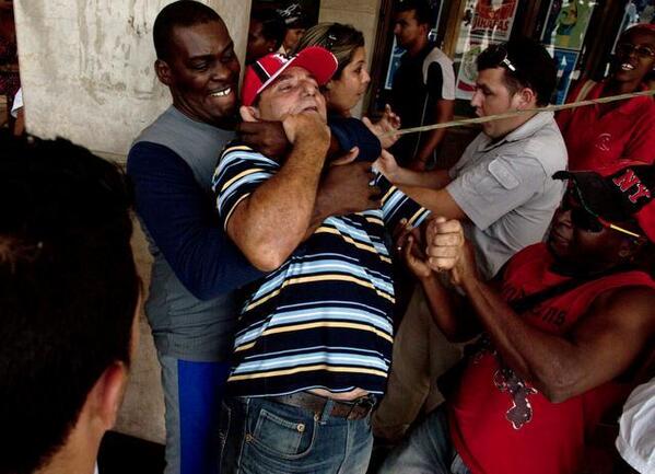 Pilar M. Munoz tweeted: Aqui los tienes maltratando a los activistas a cambio de una jabita con comida del #RegimendeCastro .